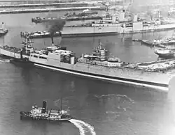 On 1 September, the heavy cruiser sailed via Propriano to Naples, where she joined Cruiser Division (CruDiv) 7. After calling at Oran, Algeria, on 6 September, Augusta, in company with Tuscaloosa, Fitch, and Murphy, stood out, bound for Philadelphia and an extensive overhaul.[5] While undergoing these repairs and alterations, Augusta suffered an explosion of unknown origin on 20 November in her ice machine room, which killed three-yard workers and injured four crew members.