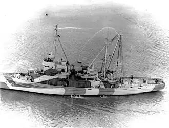 ![]() USS Avoyel (AT-150), underway on the Cooper River at Charleston, S.C., during builders trials in December 1945. Note Measure 32/17Ax camouflage.