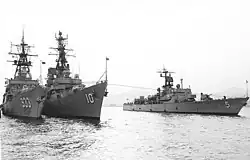 The destroyer conducted standard patrol operations in 1974.[6] 1974 was highlighted by the commissioning of the US Naval pier in Elefsis, Greece, allowing the ship to go cold iron while in port—providing much-needed relief to the ship and the crew, which had been steaming near continuously since the ship had departed Newport. While anchored in Phalron Bay, in July Barry witnessed the Greek fleet sortie from its base at Salamis with the outbreak of hostilities in the Cyprus Crisis. Barry evacuated approximately 50 military personnel and others from Athens to Naples, Italy and then returned to the Aegean for a month of tense operations during the Cyprus crisis of August and the tracking of an active sonar contact while Admiral James L. Holloway, CNO, was aboard on 19 September.[6] After NATO Exercise "Sardinia 75" in April, including type training with Italian ships, Barry began preparations to leave Athens after the Greek government canceled the naval station agreement.[6]
