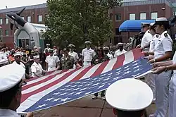 Sailors assigned to Bataan assist in the unfolding of a flag that was flying over the World Trade Center on 11 September 2001, during a ceremony in 2008