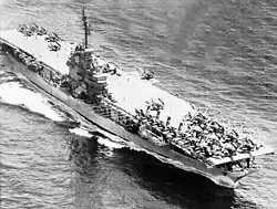 Bennington arrived in the New York Naval Shipyard for extensive repairs on 12 June. In addition to repairing the damaged area, the shipyard made major modifications originally scheduled for a later date. She received the SCB-125 modernization. The two most notable changes were the addition of an enclosed hurricane bow to lessen the potential for damage in heavy weather and of an angled flight deck to improve the efficiency of air operations. She completed repairs and alterations by 11 March 1955. On 22 April 1955, the Secretary of the Navy came aboard and presented medals and letters of commendation to 178 of her crew in recognition of their actions on 26 May 1954. As of 1 August 1955, she was part of Carrier Division 2, along with USS Lake Champlain.[5] The carrier returned to sea on 25 April to conduct carrier qualifications off Naval Station Mayport and post-overhaul shakedown training out of Guantánamo Bay. For the next four months, she conducted normal operations along the east coast and in the West Indies with ATG-201 aboard. On 8 September, the carrier embarked upon a voyage to a new home port and a new fleet. Steaming around Cape Horn, she arrived Naval Base San Diego, California, on 20 October. There, the warship joined the United States Pacific Fleet.