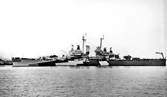 Birmingham was laid down at the Newport News Shipbuilding & Dry Dock Company at Newport News, Virginia on 17 February 1941. The completed hull was launched on 20 March 1942.[2] Fitting-out work was completed less than a year later, by which time she had been moved to the Norfolk Naval Shipyard, and she was commissioned there on 29 January 1943. Captain John E. Wilkes served as the ship's first commander. On 20 February, Birmingham embarked on her shakedown cruise in the Chesapeake Bay, which also included gunnery tests to confirm the structural integrity of her main battery turrets, practice launching and recovering her seaplanes, and shooting practice for her gun crews. On 19 March, the ship sailed for Annapolis, Maryland, to be inspected, before returning to Norfolk on 3 April for repairs. Another round of initial training followed in the Chesapeake from 23 April, including night firing practice, refueling at sea, and fighter director exercises. In late May, she returned to Norfolk for additional repairs, before departing on 8 June for the Mediterranean Sea to join forces then engaged in the Mediterranean Theater.[3]