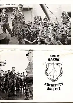 Blue Ridge was at White Beach, Okinawa when the 9th MAB was alerted on 25 March 1975 for immediate departure to Da Nang to reinforce U.S. facilities, but Blue Ridge did not get underway for Vietnam until 27 March.[30] Marines and sailors hastily trained for crowd control, evacuation procedures, and a Vietnamese orientation course. The printing section on board Blue Ridge reproduced thousands of signs in Vietnamese including a simplified instruction card for the small unit leader that included basic Vietnamese phrases and human relations oriented "do's and don'ts.[31] However North Vietnamese forces captured Da Nang on 29 March.