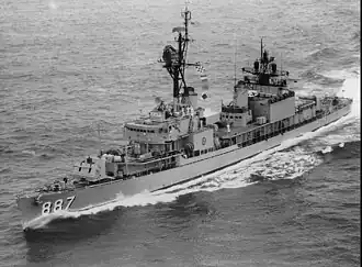 On 28 September 1965, the destroyer departed Long Beach in a task group built around the aircraft carrier USS Ticonderoga. The task group spent about two weeks engaged in exercises in the Hawaii operating area before continuing its voyage west. The warships arrived in Subic Bay in the Philippines on 30 October. Three days later, she was on her way to Vietnamese waters where she screened USS Independence (CVA-62) and served as her plane guard during air strikes on North Vietnam. That brief line tour ended 10 days later back at Naval Station Subic Bay. On 21 November, the destroyer put to sea once again. After type training at the Tabones shore bombardment range, she headed for Da Nang, South Vietnam, where she trained for duty as a search and rescue (SAR) ship in the Gulf of Tonkin. She then began a 30-day tour of duty on her SAR station.