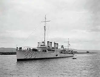 The Clemson class was a repeat of the preceding Wickes class although more fuel capacity was added.[2] The ships displaced 1,290 long tons (1,311 t) at standard load and 1,389 long tons (1,411 t) at deep load. They had an overall length of 314 feet 4 inches (95.8 m), a beam of 30 feet 11 inches (9.4 m) and a draught of 10 feet 3 inches (3.1 m). They had a crew of 6 officers and 108 enlisted men.[3]