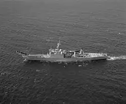 Cayuga was initially armed with four Mark 33 3-inch (76 mm)/50 caliber guns in two twin turrets. The vessel was equipped with two Mk 63 gun control fire systems (GCFS) for the 3-inch guns, but these were removed in 1977–1978.[5] The ship also had SPS-10 surface search radar.[10] Atop the stern gate, the vessels mounted a helicopter deck. They had a maximum complement of 213 including 11 officers.[8]