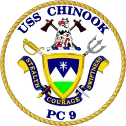 The second USS Chinook (PC-9) is the ninth Cyclone-class patrol ship of the United States Navy. Contract awarded 19 July 1991 to Bollinger Shipyards, her keel was laid 16 June 1993, and she was launched 26 February 1994. She was delivered on 7 October 1994 and commissioned on 28 January 1995. She was decommissioned on 28 March 2023.[1]