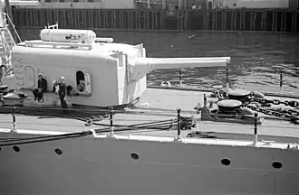 Cincinnati's main armament went through many changes while she was being designed. Originally she was to mount ten 6-inch (150 mm)/53 caliber guns; two on either side at the waist, with the remaining eight mounted in tiered casemates on either side of the fore and aft superstructures. After the United States entry into World War I the US Navy worked alongside the Royal Navy and it was decided to mount four 6-inch/53 caliber guns in two twin gun turrets fore and aft and keep the eight guns in the tiered casemates so that she would have an eight gun broadside and, due to limited arcs of fire from the casemate guns, four to six guns firing fore or aft. Her secondary armament consisted of two 3-inch (76 mm)/50 caliber anti-aircraft (AA) guns in single mounts. She also carried two triple and two twin, above-water torpedo tube mounts for 21-inch (533 mm) torpedoes. The triple mounts were fitted on either side of the upper deck, aft of the aircraft catapults, and the twin mounts were one deck lower on either side, covered by hatches in the side of the hull.[3][4][7] Cincinnati was also built with the capacity to carry 224 mines.[8]