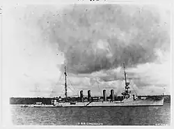 Cincinnati was ordered on 29 August 1916,[3] and contracted to be built by Todd Dry Dock and Construction Company, Tacoma, Washington,[5] on 27 August 1917. Her keel was laid on 15 May 1920, and she was launched on 23 May 1921.[3] She was sponsored by Mrs. Charles E. Tudor, wife of the Director of Safety of Cincinnati, having been designated by the Honorable John Galvin, Mayor of Cincinnati. Cincinnati was commissioned on 1 January 1924, Captain Charles P. Nelson in command.[6]