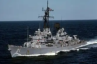 The Charles F. Adams class was based on a stretched Forrest Sherman-class destroyer hull modified to accommodate smaller RIM-24 Tartar surface-to-air missiles and all their associated equipment.[1] The ships had an overall length of 437 feet (133.2 m), a beam of 47 feet (14.3 m) and a deep draft of 15 feet (4.6 m). They displaced 4,526 long tons (4,599 t) at full load. Their crew consisted of 18 officers and 320 enlisted men.[2]