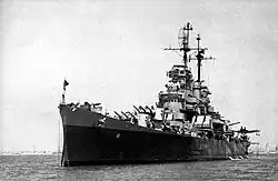 The keel for Columbia was laid down on 19 August 1940 at the New York Shipbuilding Corporation. She was launched on 17 December 1941, ten days after the Japanese attack on Pearl Harbor brought the United States into World War II. Columbia was moved to the Philadelphia Navy Yard before she was commissioned into the fleet on 29 June 1942.[2][3] After completing fitting-out work, the ship got underway for initial training on 14 September, which was carried out off Hampton Roads, Virginia, and included weapons familiarization practice and aircraft operations. Columbia then sailed for the Norfolk Navy Yard for repairs and alterations and then embarked on her shakedown cruise in Chesapeake Bay, which lasted from 16 October to 8 November The next day, she got underway and joined Task Group (TG) 2.6, which also included the fast battleship Indiana and the destroyers De Haven, Champlin, and Saufley. The ships sailed south and arrived in Panama on 13 November.[3]