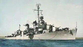 USS Cushing (DD-797) was a Fletcher-class destroyer of the United States Navy, the fourth Navy ship named for Commander William B. Cushing (1842–1874), who distinguished himself during the American Civil War. Cushing was launched on 30 September 1943, by Bethlehem Steel Co., in Staten Island, New York; she was sponsored by Miss Katherine A. Cushing, a daughter of Commander Cushing. The vessel's commissioning was on 17 January 1944.