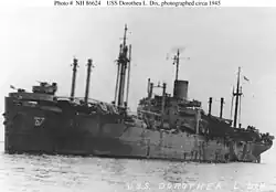 ![]() Dorothea L. Dix underway, 10 July 1943, the first day of the invasion of Sicily. A paravane is visible near the waterline about a third back from the bow.