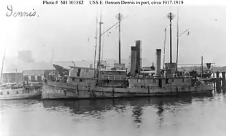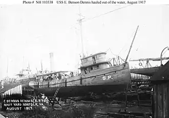 E. Benson Dennis was built as a commercial "Menhaden Fisherman"-type fishing trawler of the same name in 1901 by C. W. Crockett at Pocomoke City, Maryland. On 14 May 1917, the U.S. Navy acquired her from her owner, E. Benson Dennis of Cape Charles, Virginia, for use as a section patrol boat during World War I. She was commissioned on 15 May 1917 as USS E. Benson Dennis (SP-791).