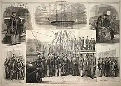 Recommissioned on 15 December 1873, Franklin operated in the North Atlantic Squadron. On 11 April 1874, she stood out to sea to join the European Squadron as flagship until 14 September 1876. On 9 January 1876, while Franklin was at Lisbon, Portugal, Ordinary Seaman Edward Maddin and Seaman John Handran jumped overboard and rescued a shipmate from drowning, for which they were later awarded the Medal of Honor.[2] In the aftermath of the Salonika Incident in May 1876, the U.S. Ambassador, Horace Maynard, requested that Franklin steam to the Aegean Sea to protect U.S. interests and citizens.[3] Later that year, Franklin transported the corrupt politician William M. "Boss" Tweed — arrested in Spain after escaping from Ludlow Street Jail in New York City — from Spain to New York City, where she arrived on 23 November 1876.[4][5][6]