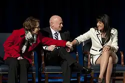 During the ship's naming announcement on 10 February 2012, Secretary Mabus said that the Navy had chosen to name the ship Gabrielle Giffords because Rep. Giffords' name had become "synonymous with courage" and that the congresswoman had "inspired the nation with remarkable resiliency."[16] The secretary also called the naming a tribute to Navy families, stating that Giffords was a "Navy spouse" who made efforts to support the Navy during her time in Congress.[16] Giffords is married to Captain Mark Kelly (Ret.), a former naval aviator and astronaut.[16][23]
