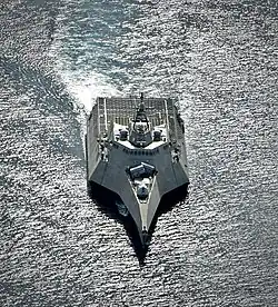 In 2002, the U.S. Navy initiated a program to develop the first of a fleet of littoral combat ships.[21] The Navy initially ordered two trimaran hulled ships from General Dynamics, which became known as the Independence-class littoral combat ships after the first ship of the class, USS Independence.[21] Even-numbered U.S. Navy littoral combat ships are built using the Independence-class trimaran design, while odd-numbered ships are based on a competing design, the conventional hull Freedom-class littoral combat ship.[21] The initial order of littoral combat ships involved a total of four ships, including two of the Independence-class design.[21]