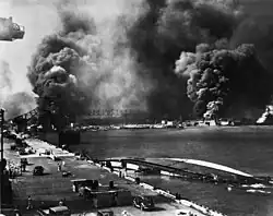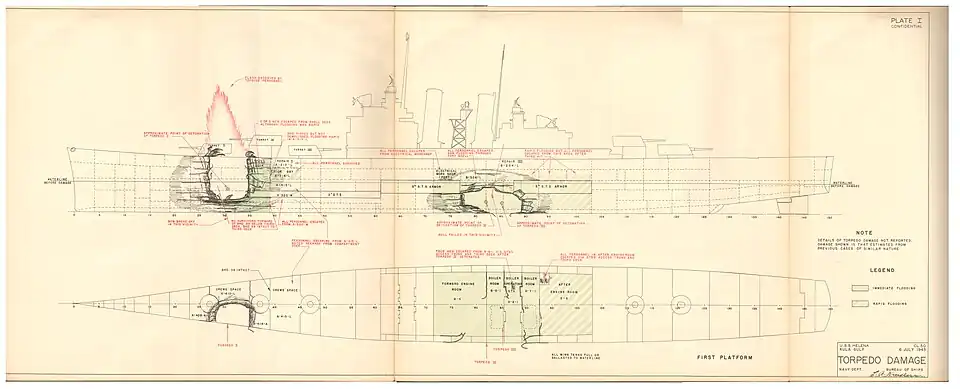 On the morning of 7 December, the Japanese launched their surprise attack on the American fleet with a first wave of forty Nakajima B5N torpedo bombers, fifty-one Aichi D3A dive bombers, and fifty B5N high-level bombers, escorted by forty-three Mitsubishi A6M Zero fighters.[21] The Japanese expected Pennsylvania to be in her normal berth. Three minutes into the attack, which had begun at 07:55, a B5N torpedo bomber dropped its torpedo at what its pilot expected to be the battleship. The torpedo passed underneath Oglala and exploded against Helena's hull on the starboard side, nearly amidships. The blast tore a hole in the hull that flooded the starboard engine and boiler rooms and severed wiring for the main and secondary guns. The ship's crew raced to their battle stations and two minutes after the torpedo hit, the backup forward diesel generator had been turned on, restoring power to the guns.[17][22] Oglala was less fortunate than Helena, as the blast effect loosened hull plates on the minelayer and caused her to capsize.[23]