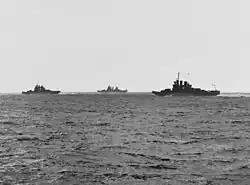 Helena and the rest of her unit then returned to Espiritu Santo to refuel and replenish ammunition, remaining there until the morning of 22 January.[63] Halsey had ordered Ainsworth to make an attack on Vila on the island of Kolombangara to neutralize the airfield there, and on 23 January he conducted a feint toward Munda to throw off Japanese aircraft who might have launched night torpedo attacks against his vessels. As at Munda, Ainsworth left a pair of cruisers and three destroyers to provide distant support while he took Helena, Nashville, and four destroyers into Kula Gulf to shell the airstrip. A "Black Cat" PBY Catalina provided spotting support while the two cruisers fired around 3,500 shells from the main and secondary gun, inflicting significant damage on the airfield and equipment. The Japanese launched group of eleven floatplanes to scout for Ainsworth's cruisers while a second group of thirty Mitsubishi G4M bombers, but the American ships used rain squalls to evade the floatplanes, along with long-range 5-inch fire directed by the SC and FD radars to keep the aircraft at bay. At dawn, a group of five P-38 fighters arrived to escort the ships during their continued withdrawal.[64][65]