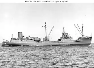 USS Kaula (AG-33) was built in 1938 by Henry Robb Ltd, in Leith, Scotland. She was acquired by the U.S. Navy as Cubahama 3 January 1941 from her owner, Balboa Shipping Company of New York and renamed Kaula 15 January then commissioned at Baltimore, Maryland 22 January.[1]