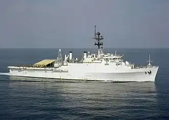 La Salle was converted to a "miscellaneous command ship" and given the hull classification symbol AGF-3 after an overhaul in 1972. After re-fitting in 1972 she was sent to homeport in Bahrain and serve in a mainly surveillance capacity, with as many as 60 NSA personnel assigned to the ship, at a time when one of America's main allies in the Middle East, the Shah of Iran, controlled the Persian Gulf. To accommodate all the extra electronic equipment, the La Salle was painted white to reflect the heat of its operating environment. Admiral William J. Crowe, who later became Chairman of the Joint Chiefs of Staff under President Ronald Reagan, was named Commander Middle East Force and assigned to La Salle to serve in this sensitive role. In this time before the Gulf War, piracy off the east coast of Africa and the re-activation of the U.S. Fifth Fleet, only La Salle along with two U.S. Navy destroyers dispatched from the U.S. east coast on a six-month rotating basis were routinely on patrol in the Persian Gulf, Red Sea and the general Indian Ocean regions. La Salle was considered by the Navy to be isolated duty and anything but a plum assignment by its crew. To symbolize its relatively minor status as a fighting ship at this time, La Salle's nickname, emblazoned on T-shirts sold in the ship's store and wryly smiled about by those many of the ship's crew who wore them, unofficially became "The Great White Whale". By the time of Gulf War the ship had become known, more appropriately to its future operational roles, by its new nickname "The Great White Ghost of the Arabian Coast".[1]