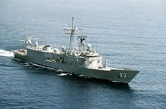 USS Lewis B. Puller (FFG-23) was the fifteenth ship of the Oliver Hazard Perry class of guided-missile frigates in the United States Navy. She was the first US Navy ship to be named for United States Marine Corps Lieutenant General Lewis B. "Chesty" Puller (1898–1971). Ordered from Todd Pacific Shipyards, Los Angeles Division, San Pedro, California on 28 February 1977 as part of the FY77 program, Lewis B. Puller was laid down on 23 May 1979, launched on 15 March 1980, and commissioned on 17 April 1982. Decommissioned and stricken on 18 September 1998, she was transferred to Egypt the same day as Toushka (F906).[1]