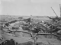 Disinterment ended at 10:00 p.m. local time.[74] The 151 coffins were taken to Machina Wharf and held under guard overnight.[66][71][77] Early the next morning, the coffins were placed about two small steamships, which took the dead at 6:00 a.m. to the Texas.[74] The coffins were arranged on the Texas's afterdeck in groups and covered in canvas. Many American flags and wreaths evergreens and artificial flowers were placed on the canvas coverings, and the coffins guarded by U.S. Marines day and night until the ship reached Hampton Roads.[75]