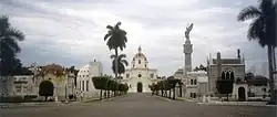 The first memorial to the Maine dead was constructed in the first six months of 1900.[92] Near the field of the Maine dead a concrete base was poured. Two Spanish mortars – taken by Admiral George Dewey from Cavite Arsenal in Manila, The Philippines, at the end of the Spanish–American War—were placed on brick piers on either side of this base.[93]