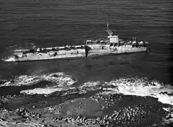 USS Makassar Strait (CVE-91) was a Casablanca-class escort carrier of the United States Navy. She was named after the Battle of Makassar Strait, an early naval engagement to the east of Borneo. Launched in March 1944, and commissioned in April, she served in support of the Battle of Okinawa. Postwar, she participated in Operation Magic Carpet. She was decommissioned in August 1946, when she was mothballed in the Pacific Reserve Fleet. Ultimately, she was used as a target, and she was accidentally run aground on San Nicolas Island in April 1961. Her wreckage survived until at least 1965.