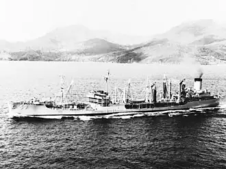 Statistics regarding the distance that the Manatee traveled in its first year of service and the amounts of oil and gasoline the ship transported and discharged are impressive. Manatee steamed 65,205 nautical miles (120,760 km; 75,037 mi) during 198 days at sea between 6 April 1944, and 6 April 1945.[2] In its support of Pacific land, sea, and air operations, the Manatee discharged in just that twelve-month period 1,319,468 barrels of black oil; 39,476 barrels of diesel oil; and 3,250,993 gallons of gasoline.[2] Each of those replenishment totals would, of course, increase appreciably by war's end.
