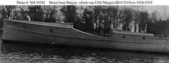 This article incorporates text from the public domain Dictionary of American Naval Fighting Ships. The entry can be found here.- Department of the Navy Naval History and Heritage Command Online Library of Selected Images: Civilian Ships: Margin (Motor Boat, 1917). Served as USS Margin (ID # 2119) in 1918-19