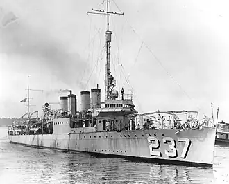 Repairs completed by 17 April 1943, McFarland sailed for the west coast. Redesignated DD-237 on 1 December 1943, and homeported at San Diego, California for the remainder of the war, she operated with aircraft carriers as they conducted training exercises and pilot qualification landings. On 30 September 1945, she sailed for the east coast.