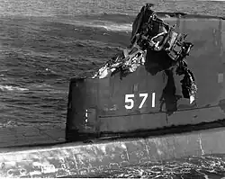 On 2 May 1966, Nautilus returned to her homeport to resume operations with the Atlantic Fleet, and she logged her 300,000th nautical mile (560,000 km; 350,000 mi) underway that month. She next conducted special operations for ComSubLant and then returned to Portsmouth in August 1967 for another year's stay. During an exercise in 1966, she collided with the aircraft carrier USS Essex on 10 November while at shallow depth.[28] Following repairs in Portsmouth, she conducted exercises off the southeastern seaboard. She returned to New London in December 1968 and operated as a unit of Submarine Squadron 10 for most of the remainder of her career.