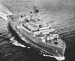 After training off Norfolk, Virginia, Ogden arrived at San Diego, California, on 29 October 1965 to join the United States Pacific Fleet and complete her initial training. In her first year of service the ship deployed twice to South Vietnam (8 February through 4 April 1966 and 16 May through 7 July 1966), bringing Marines and their equipment to the Vietnam War. On her return passages, she brought damaged vehicles home for repair.[1] During the summer of 1966, she conducted experiments with aircraft capable of vertical or short landing and take-off. Ogden participated in Operation End Sweep in Haiphong Harbor as a member of Task Force 78 from January 1973 through July 1973, clearing mines with RH-53A helicopters.[2]