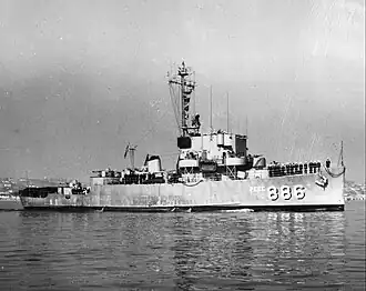 PCE-886 was laid down by Albina Engine & Machine Works, Portland on 29 March 1944 and launched on 10 July 1944. She was commissioned on 31 May 1945.