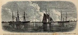 Pawnee spent the first three months of 1861 in Washington, D.C., and was sent on an expedition to Charleston, South Carolina 6 April to relieve Major Robert Anderson's garrison at Fort Sumter. Delayed by a severe storm, she arrived only to find that the Fort had been surrendered to Confederate forces. She returned to Washington and was immediately dispatched to Norfolk to secure the ships and stores of the Gosport Navy Yard.[2] Arriving at Norfolk the night of 20 April, she found that all ships, save USS Cumberland, had been scuttled, so an attempt was made to destroy the Naval stores and the dry dock.[2] Their efforts were largely unsuccessful, but she assisted the tug Yankee, which towed the frigate Cumberland out of the Yard and saved the ship.[3]