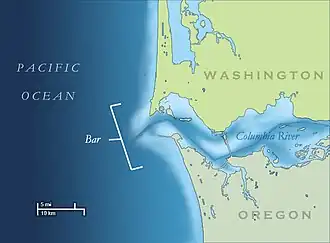 On 2 December the Peacock departed for the Pacific Northwest.[63] It reached the mouth of the Columbia River on 17 July 1841. In the afternoon of the following day Hudson ordered the Peacock to cross the Columbia Bar. Unfortunately, the Peacock soon hit a shoal and proceeded to be battered by the current. After struggling to keep it afloat throughout the night, the crew was rescued the following morning. The Peacock was soon destroyed thereafter.[64] While much of the scientific data had been taken off, Titian Peale lost most of his notes.[65]