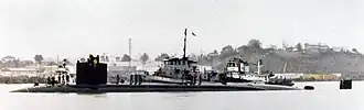 ![]() USS Pollack (SSN-603) receives assistance from U.S. Navy tug USS Skenandoa (YTB-835) (center rear) while arriving off Mare Island Naval Shipyard, Vallejo, California, in January 1988 for inactivation.