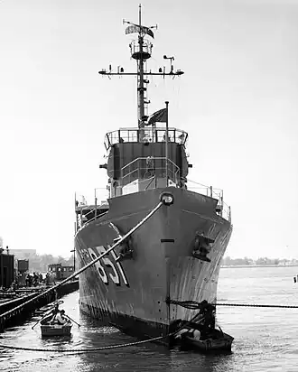 On 15 October 1951, she was re-designated as EPCER-851 (experimental patrol craft escort rescue) for use out of Washington DC with the Naval Research Laboratory.[4] At some point with the designation, she was disarmed. Her complement would also change to 5 officers, 55 enlisted, and 12 technical/scientific personnel.[7] She conducted a variety of experiments with the laboratory, including sonar effectiveness,[8] acoustic surveys,[9] and oceanic mapping.[10]