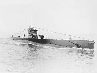 S-45′s keel was laid down on 29 December 1920 by the Bethlehem Shipbuilding Corporation's Fore River Shipyard in Quincy, Massachusetts.[1] She was launched on 26 June 1923, sponsored by Mrs. Charles Hibbard, and delivered and commissioned on 31 March 1925.[1]