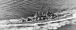 Santa Fe was laid down at the New York Shipbuilding Co. at Camden, New Jersey, on 7 June 1941. She was launched of 10 June 1942, and after completing fitting out, she was commissioned on 24 November. Captain Russell S. Berkey served as the ship's first commanding officer. She thereafter conducted her shakedown cruise and initial training off the East Coast of the United States into early 1943, before sailing for the Pacific Ocean, where she joined the forces engaged in the Pacific Theater of World War II. She arrived in Pearl Harbor, Hawaii, on 22 March and proceeded from there to the Aleutian Islands. She arrived in Alaskan waters on 20 April, and six days later she took part in a bombardment of Japanese-held Attu Island. She participated in patrols off the Aleutians for the next four months during the Aleutian Islands campaign, and she shelled Kiska on 6 and 22 July before American forces landed on the island the following month. She provided gunfire support to the forces that went ashore there on 15 August. Ten days later, Santa Fe left the area and arrived back in Pearl Harbor on 1 September.[3]