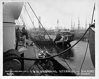 The third USS Saranac was the Old Dominion Steamship Company Hamilton temporarily converted for planting the World War I North Sea Mine Barrage. John Roach & Sons launched Hamilton at Chester, Pennsylvania in 1899. Hamilton steamed between Norfolk, Virginia and New York City until The United States Shipping Board took control of the ship from Old Dominion Steamship Company in 1917. She was fitted out for United States Navy service by James Shewan & Sons at Brooklyn, New York. The minelaying conversion enabled her to carry mines on two decks, and included four Otis elevators individually capable of transferring two mines every 20 seconds from the storage deck to the launching deck. USS Saranac was commissioned on 9 April 1918. While operating as part of Mine Squadron 1 out of Inverness, Scotland, from 14 July until the close of the war on 11 November 1918, Saranac laid a total of 4,782 mines:[1]