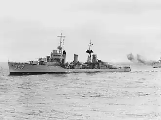 Transiting the Panama Canal on 7 September 1944, Selfridge proceeded to New York for an abbreviated overhaul after which she joined TF 65; and, serving as flagship, commenced transatlantic escort duty for convoys plying between the east coast and Tunisia. On 23 April 1945 she was in Casco Bay, Maine when USS Eagle 56 (PE-56) exploded. After assisting in rescuing survivors, she dropped nine depth charges on a suspected U-boat.[1] A Court of Inquiry initially attributed the loss of Eagle 56 to a boiler explosion, but in 2001 the cause was revised to a torpedo from U-853.[2] Continuing escort duty until after the fall of Germany in May 1945, she completed her last run at New York on 7 June. Upkeep and training exercises in the Caribbean and off the Maine coast took her through August; and, on 15 September, she returned to New York to prepare for inactivation.