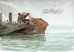 On 9 October 1918, while escorting Aquitania, Shaw's rudder jammed just as she was completing the right leg of a zigzag, leaving her headed directly towards the transport. A moment later, Aquitania struck Shaw, cutting off 90 feet (27 m) of the destroyer's bow, mangling her bridge and setting her on fire. Shaw's crew brought her damage under control, and a skeleton crew of 21 men took the wreck 40 miles into port under her own power. Twelve men died in the accident.