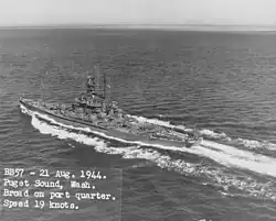 The keel for South Dakota was laid down on 5 July 1939, at the New York Shipbuilding Corporation in Camden, New Jersey. She was launched on 7 June 1941 and was commissioned into the fleet on 20 March 1942.[3] She was then towed across the river to the Philadelphia Navy Yard and began fitting out; Captain Thomas Leigh Gatch was her first commanding officer. This work was completed by 14 May, and over the next two days she did machinery tests in the Delaware River, followed by more fitting out work that lasted until 3 June. Two days later, she began her shakedown cruise, escorted by four destroyers owing to the threat of German U-boats operating off the east coast of the United States. Over the following two days, she tested her engines at various speeds and test fired her guns to check for structural problems. Training in the area continued until 17 July and the next day, she departed for Hampton Roads, Virginia with four destroyers as escort. From there, she cruised back north to meet the battleship Washington off the coast of Maine before anchoring at Casco Bay on 21 July. There, she engaged in further firing practice before steaming to Philadelphia and being declared ready for active duty on 26 July.[8]