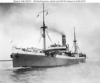 St. Francis was then transferred from an Army to a US Shipping Board Account. On 26 January 1919 she left the US for Cristóbal. She passed through the Panama Canal, and on 17 February reached Valparaíso, Chile. She returned through the canal, loaded a commercial cargo of sugar at Cienfuegos, Cuba, and on 8 April arrived in New York. The Navy decommissioned her at New York on 28 April 1919, and returned her via the US Shipping Board to her owners,[7] who restored her name to San Francisco.