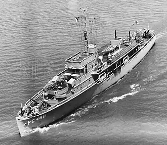 On 24 January 1942 in the Gulf of Panama about fourteen miles west of San Jose Light, PC-460 accidentally rammed and sank the submarine USS S-26. PC-460 was escorting USS S-21, USS S-26, USS S-29, and USS S-44 from the harbor of Balboa, Panama to their patrol stations when at 2210 the Sturdy sent a visual message to the submarines that she was leaving the formation and that they could proceed on the duty assigned.[1] S-21 was the only submarine to receive this message. Shortly thereafter, PC-460 struck S-26 on the starboard side of the torpedo room and the submarine sank within a few seconds. Salvage operations started immediately but were not successful.[1]
