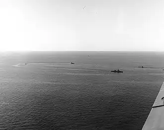 By morning on 11 April, submarines USS Seawolf and USS Sea Owl, both operating near Thresher's location, were ordered to join in the search for the missing submarine. The Navy quickly mounted an extensive search with surface ships and support from the Naval Research Laboratory (NRL), with its deep-search capability. The laboratory's small acoustic research vessel Rockville, with a unique trainable search sonar, left on 12 April 1963 for the search area. Rockville was to be followed by other personnel with a deep-camera system. Allegheny, Mission Capistrano, and Prevail became engaged in a close sonar search of an area 10 nmi (19 km; 12 mi) square. Atlantis II, Robert D. Conrad, and James M. Gilliss investigated likely contacts found in the sonar search. The NRL deep-towed camera system and personnel later operated from James M. Gilliss with some success, finding debris later confirmed to be from Thresher.[17] The bathyscaphe Trieste was alerted on 11 April and brought from San Diego to Boston. It was deployed for two series of dives into the debris field; the first taking place from 24 to 30 June, and the second from late August until early September. The equipment-handling capability of Gilliss proved inadequate, even hazardous, to handle the towed vehicle, and the entire search was paused in September.[18][19]