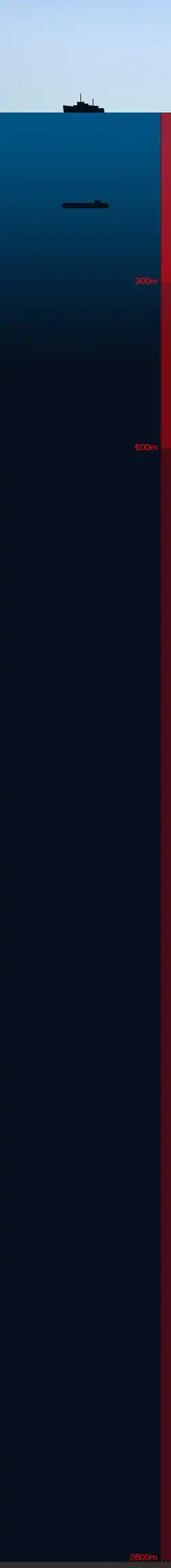 It was believed at the time that Thresher likely imploded at a depth of 1,300–2,000 ft (400–610 m), though 2013 acoustic analysis concluded implosion occurred at 2,400 ft (730 m).[31]
