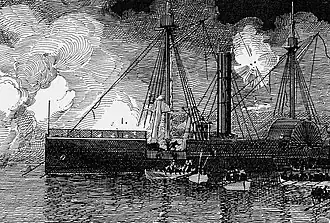 ![]() Confederate troops abandoning USS Underwriter after setting her afire, 2 February 1864